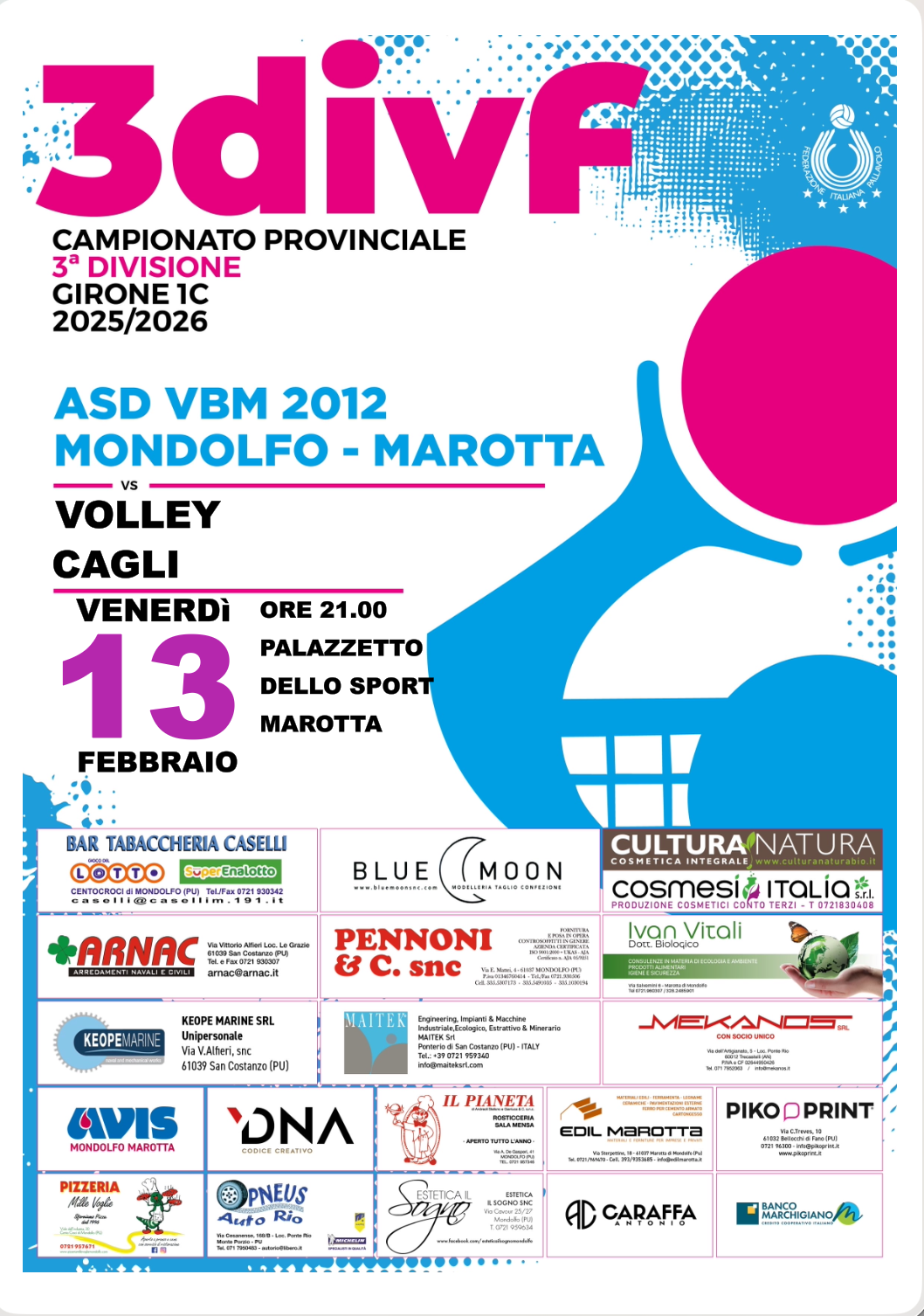 - La stagione 2025/26 della Volleyball Mondolfo Marotta entra nel vivo35 anni di sport, passione e comunitร Con lโavvio dei campionati Under 13 e 3ยช Divisione, la ASD Volleyball Mondolfo Marotta completa ufficialmente la partenza della stagione sportiva 2025/26, giร โฆ Leggi tutto: La stagione 2025/26 della Volleyball Mondolfo Marotta entra nel vivo